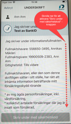 - Läsa igenom informationstexten i BankID-appen, ibland måste man skrolla hela vägen ner för att Skriv under ska aktiveras i BankID-appen