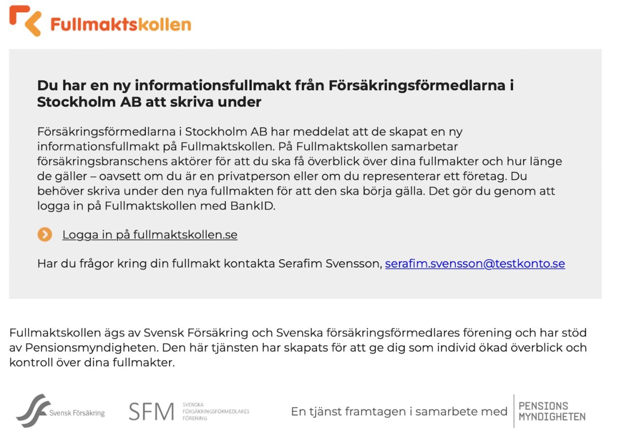 Mejlet/SMS:et innehåller en länk till www.fullmaktskollen.se där kunden kan logga in med BankID för att skriva under fullmakten.