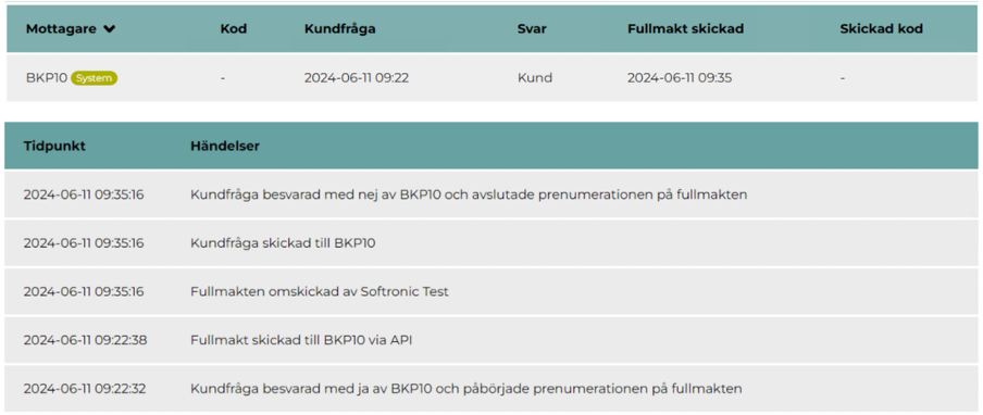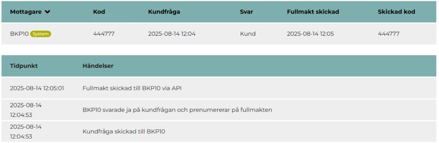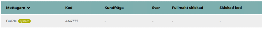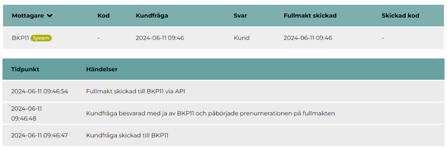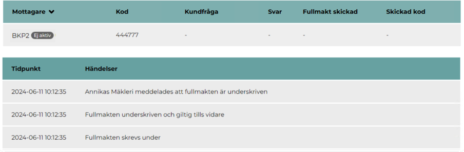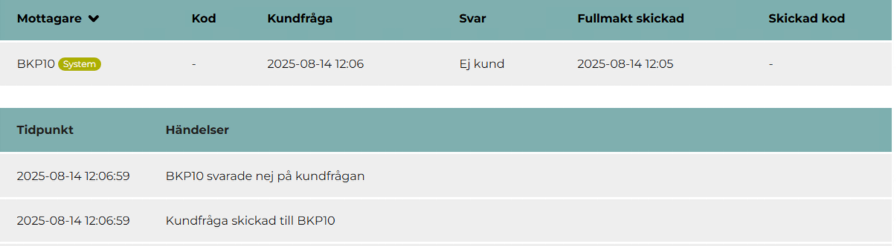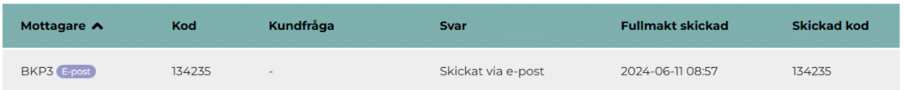 En kundfråga skickades till mottagaren som besvarades med ”Ej kund” vid tidpunkten som är angiven i listan. Eftersom ingen fullmaktsinformation har skickats till mottagaren finns heller ingen uppgift om kod, även om den var angiven på fullmakten när den skapades.